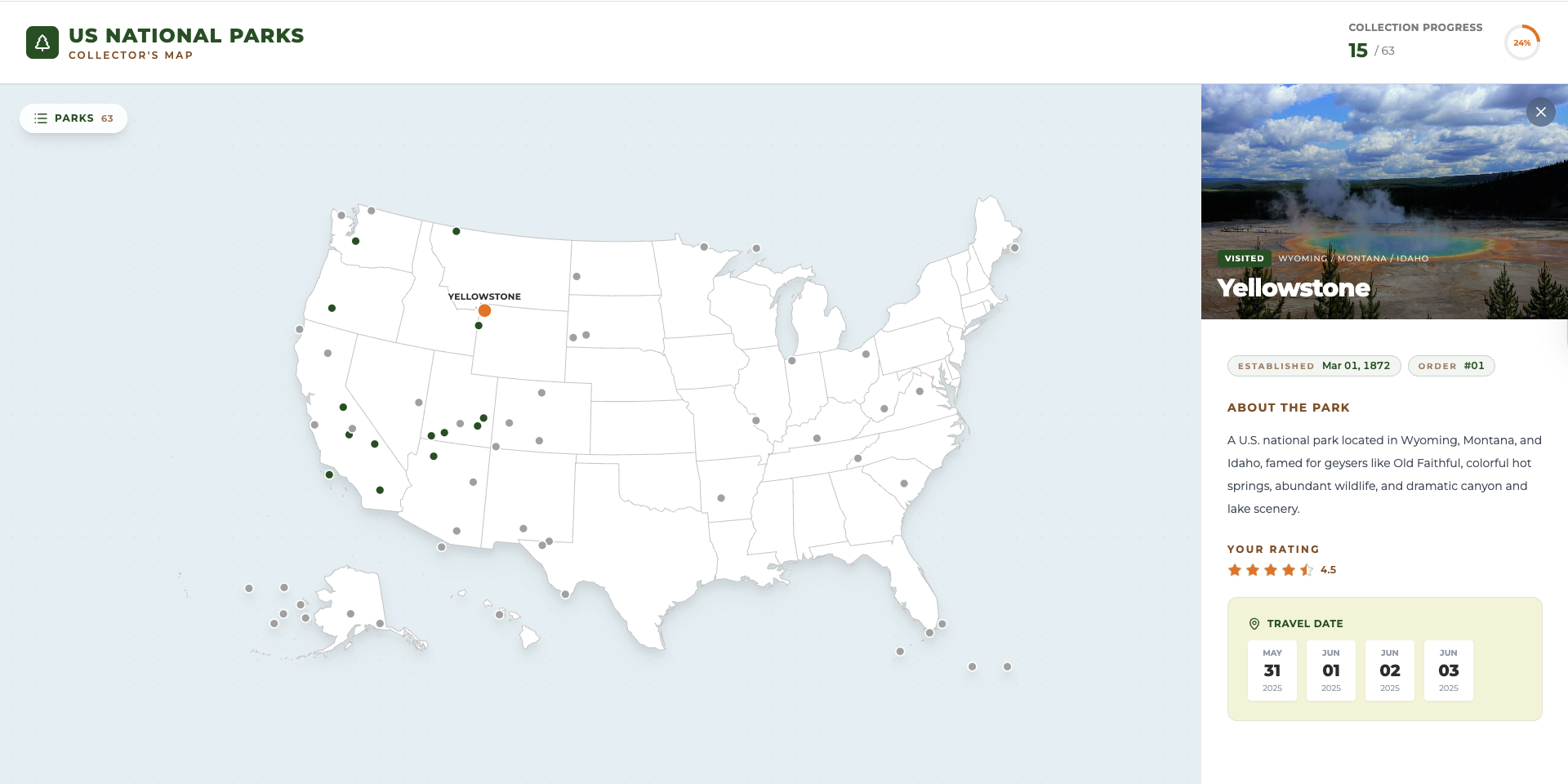 At first, I thought I only needed a checklist. But a checklist does not feel like a journey; it feels like a task. I wanted something more visual, calmer, and closer to how travel memories actually work. So I built ParkMarks with the map as the starting point. The map is not just decoration; it is the main interface. When you move across the United States, states respond, the geography feels alive, and parks appear as places you can return to, both literally and emotionally. Clicking a marker opens the park details, and that is where the app shifts from map to journal.